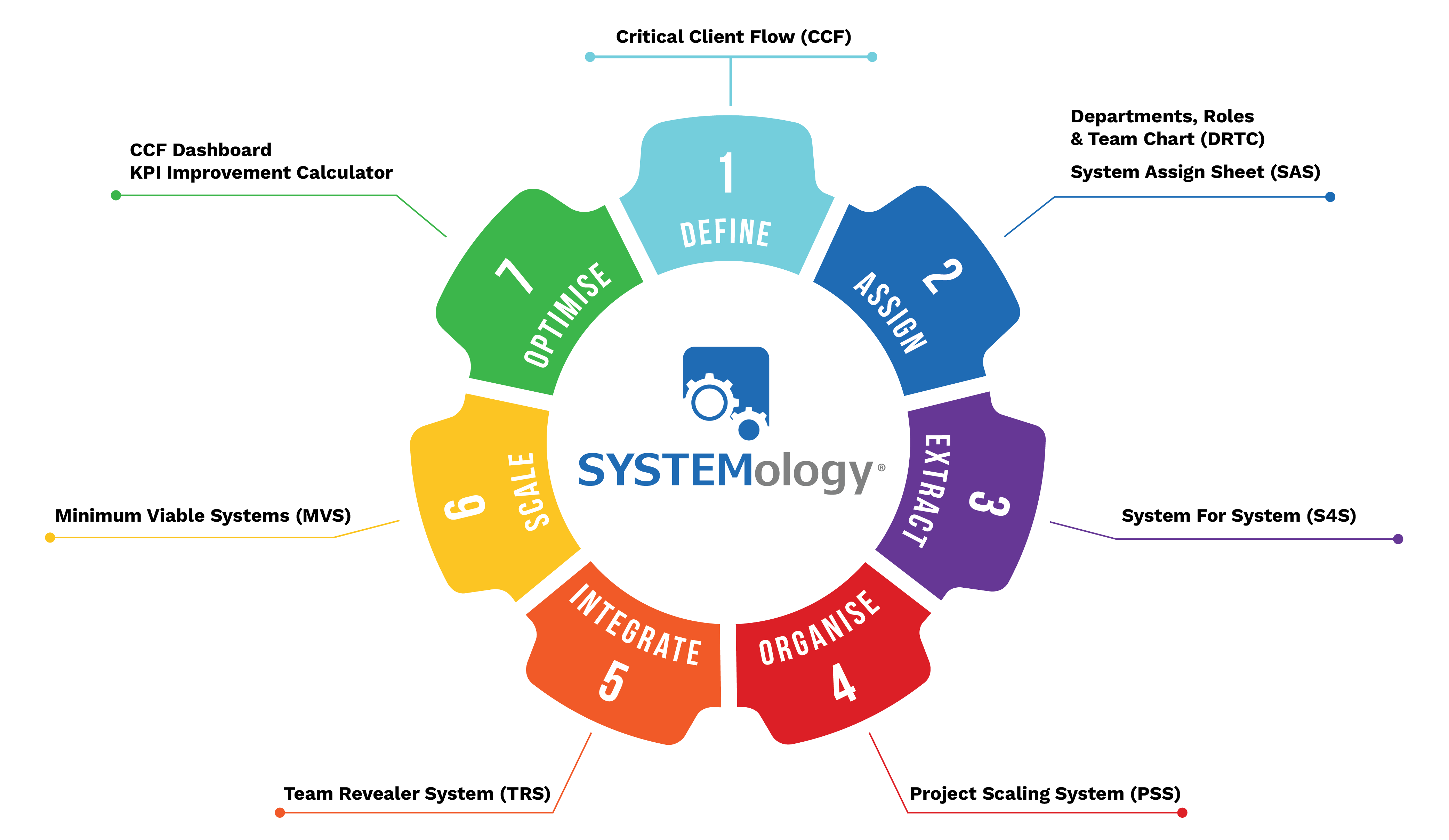 Hoewel elk bedrijf anders is qua samenstelling en groeifase, is het proces hetzelfde. Wanneer u met een gecertificeerde SYSTEMologist werkt, kunt u erop vertrouwen dat hij of zij werkt volgens ons beproefde, gepatenteerde 7-stappenproces.